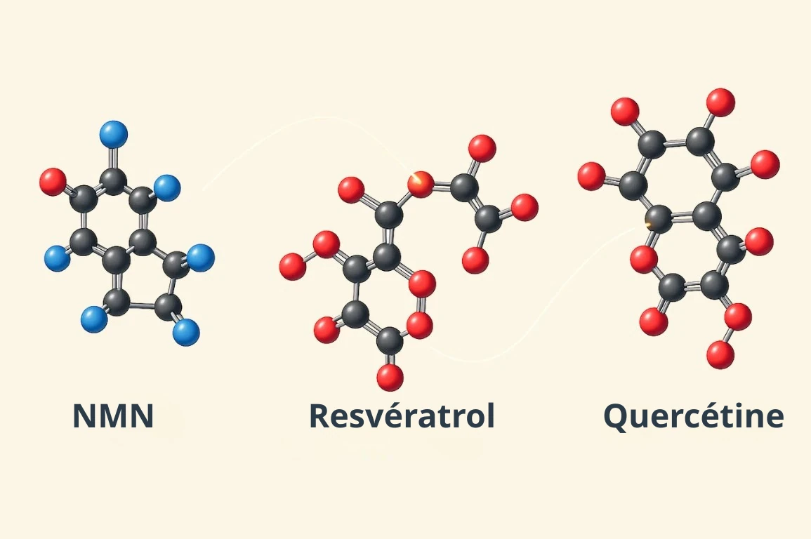 Cette combinaison est unique : des études montrent que NMN + resvératrol augmentent les taux de NAD+ de 59 % de plus que le NMN seul (New Study PMC).