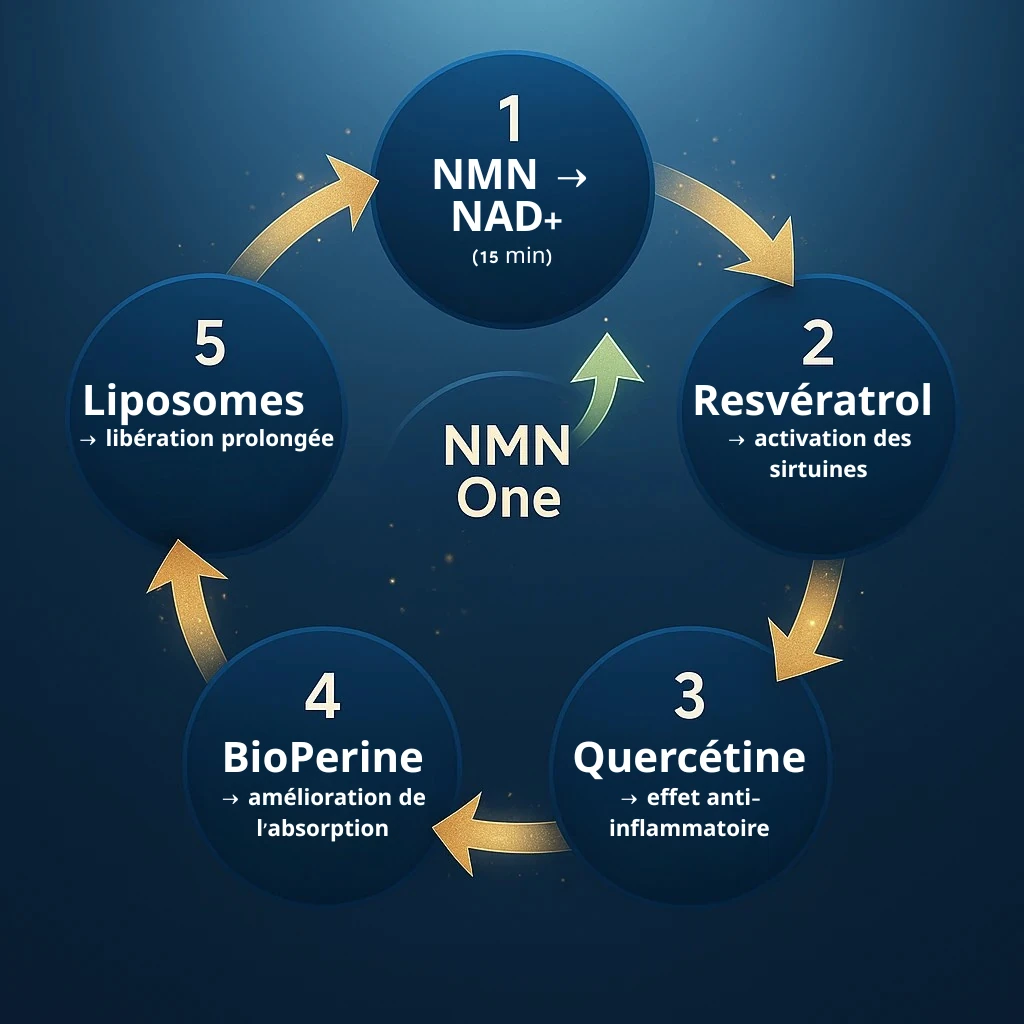 « NMN ONE contourne les barrières biologiques qui bloquent les autres compléments. Il pénètre directement dans la cellule et se transforme en NAD+ en quelques minutes. »