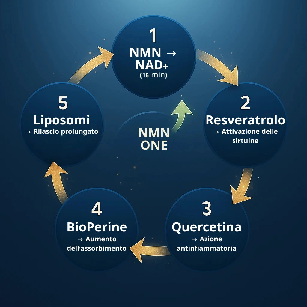 "NMN ONE supera le barriere biologiche che bloccano altri integratori. Entra direttamente nella cellula e viene trasformato in NAD+ nel giro di pochi minuti."
